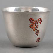 1e gehalte zilveren kommetje met vensteremail in bloemmotieven, Londen, 1975, gewicht 127 gram, Ø 7,7 × 5 cm