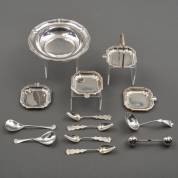Divers klein zilver, waaronder gebaksvorkjes en paar zoutschaaltjes met zilveren montuur, gewicht zonder zoutvaatjes: 390 gram