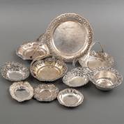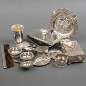 Divers 1e en 2e gehalte klein zilverwerk, waaronder: standaard met vier asbakjes, schaaltje en rammelaar, gewicht 309 gram, schaaltje Ø 15,5 cm -veelal met gebruikssporen-