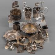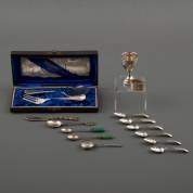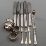 Divers klein zilverwerk: vijf stalen messen met zilveren heften, vier servetringen, kristallen flacon met zilveren dop, drie taartvorkjes, en enkele vork, brutogewicht: 709 gram