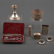 Divers handwerkzilver, diverse gehaltes waaronder twee 2e gehalte zilveren naaldenkokers, niëllo vulpotloodje, en drie schaartjes waarvan één met schede, brutogewicht 159 gram, grootste schaar 17,5 cm