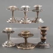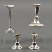 2e gehalte zilveren anjervaasje, paar 1e gehalte zilveren tafelkandelaartjes en 1e gehalte zilveren kandelaar, brutogewicht 475 gram -alle met gevulde voet en alle kandelaars hebben zware gebruikssporen en of defecten-