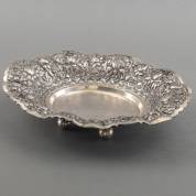Ovale BWZG Djokja schaal, gemerkt 800, op vier bolpoten, gewicht 523 gram, 31 × 24 × 7 cm