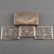Vier BWZG Djokja sigarettendoosje, waarvan één paar en twee met houten interieur, brutogewicht 791 gram, grootste doos 14 × 8 × 4 cm