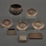 Zilveren pepermuntdoosje, notitieboekje, vier schaaltjes, luciferdooshouder, en een kom, Thailand, diverse gehaltes, brutogewicht 337 gram