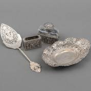Vier BWZG Djokja voorwerpen: bonbonmandje, taartschep, flacon en luciferdooshouder, brutogewicht 315 gram
