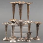 Tien diverse BWZG Djokja vaasjes, veelal anjervaasjes, gewicht 618 gram, hoogste vaasjes 15 cm