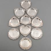 Tien BWZG Djokja schoteltjes, bestaande uit serie van vijf, drie en twee, gewicht 462 gram, circa Ø 10 cm