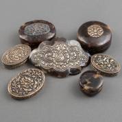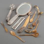Divers BWZG Djokja, waaronder hoornen lepels met Djokja applique en BWZG Djokja klontjestang in de vorm van een klauw, tang 15 × 4,2 cm