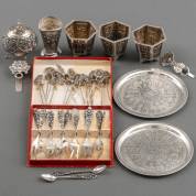 Divers BWZG Djokja zilver, waaronder cocktailprikkers, daarbij: drie Chinese cupjes, en twee Oosterse onderzetters, gewicht 390 gram, onderzetters Ø 10 cm