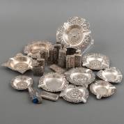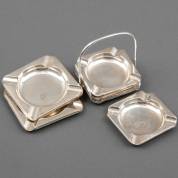 Negen 2e gehalte zilveren tafelasbakjes, diverse maten, waarvan één standaard met hengsel, gewicht 120 gram, 6,5 × 6,5 cm