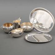 Twee zilveren roomstellen: grootste 3e gehalte zilver, Duitsland, kleinere samengesteld, 1e gehalte zilveren dienblaadje waarop een tweede gehalte zilveren roomkan en suikerpotje, 1949, gewicht 652 gram, hoogte 8 cm