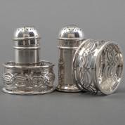 Paar 1e gehalte zilveren strooiers, Birmingham, 1917, en paar 1e gehalte opengewerkte servetringen, gewicht 117 gram, Ø 5 cm