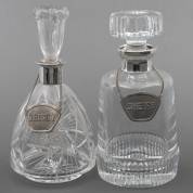 Twee geslepen kristallen karaffen met 1e gehalte zilveren montuur, kristallen stop en onedele labels voor whisky en sherry, karaf Ø 10 × 22 cm