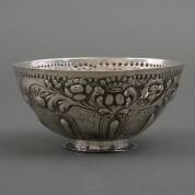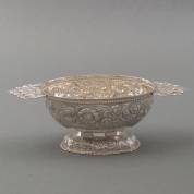 Zilveren brandewijnkom, met gedreven bloemdecor, de grepen met twee putti en bloemen, beide grepen met toetsstreek, niet gekeurd, Friesland, circa 1780, gewicht 290 gram, 8,6 × 25 × 12,8 cm
