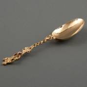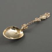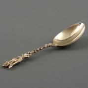 Verguld zilveren gelegenheidslepel, de getorste steel gekroond met Caritas, meester: Matthijs Woortman, Amsterdam, 1774, gewicht 63 gram, 19 × 4,8 cm