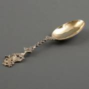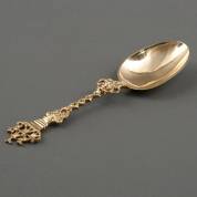 Verguld zilveren gelegenheidslepel, de getorste steel bekroond met Geloof, Hoop en Liefde, de bak verso met stippelgravering: 'Pijter Cornelis is geboren, den 23 mai 1762, meester: Johannes Jelgerhuis, Leeuwarden 1762 gewicht 58 gram, 18 cm -deukje in de bak door geslagen keur-