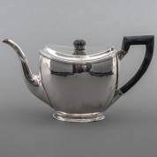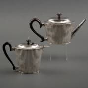 Taps toelopende 1e gehalte zilveren theepot en melkkan, met cannelures, parelranden en ebbenhouten grepen, meester: Pieter van Reidt, Amsterdam, 1798, brutogewicht 579 gram, melkkan 13 × 17 × 8 cm, theepot 13 × 23 × 10 cm