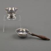 1e gehalte zilveren theezeefje met gecontourneerde rand, houten greep en lekbakje, meester: J. A. Campbell, Londen, 1993, gewicht 75 gram, Ø 6 × 15 cm
