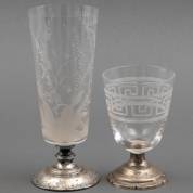 Kristallen glas op 2e gehalte zilveren voet, het glas met gegraveerd decor van bloemtakjes en opschrift: '1854-juni-1879', 19,5 cm, en kristallen glas met gegraveeerd meanderdecor, op 2e gehalte zilveren voet, 12,3 cm