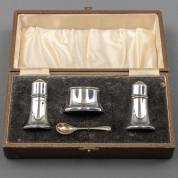 1e gehalte zilveren ménagèreset, Birmingham, 1955, in foedraal, gewicht zilver 80 gram, hoogte strooiertjes 6,5 cm