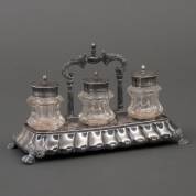 1e gehalte zilveren inktstel met twee kristallen inktpotjes en een zandstrooier met 2e gehalte zilveren montuur en dop, en uitsparing voor vier pennen, meester: Johann Carstens & Georg Quilhorst, Amsterdam, 1841-1844, gewicht zilver 347 gram