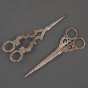 Twee scharen met 2e gehalte zilveren grepen: druivenschaar met volutendecor, 1870, en schaar met papegaaiendecor in schede -één handvat gerepareerd-, brutogewicht 119 gram