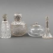 Drie kristallen flacons en een wattendoos met 1e gehalte zilveren monturen, Engeland, 20e eeuw, hoogste 14 cm