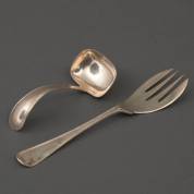 2e gehalte zilveren dienvork, rondfilet, meester: B.H. Driessen, Utrecht, 1931, en 2e gehalte zilveren sauslepel, meester: Jacobus Schalkwijk, Rotterdam, 1842 -gravering-, gewicht 134 gram
