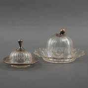 Een kristallen kaasstolp en botervloot, beide met 2e gehalte zilveren knop, kaasstolp Ø 26 cm -kaasstolp met randchips-
