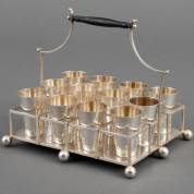 Twaalf 3e gehalte zilveren likeurbekertjes in houder, Duitsland, 20e eeuw, 14 × 15,5 × 12,5 cm, brutogewicht 442 gram