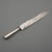 Aansnijmes met achtkantig zilveren heft met gegraveerde allegorische voorstelling, tulpmotieven en gegraveerd: 'Pieter Gerritsz : Wit - Anno 1758', meester: Dirk Froger, Amsterdam, 1752, lemmet gemerkt Avenhage, brutogewicht 141 gram, 33 × 3 cm, in juweliersdoos