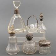 Zes kristallen flacons, één met geslepen motieven, alle met 1e of 2e gehalte zilveren montuur en of dop, daarbij kristallen schaaltje met 2e gehalte zilveren hengsel, grootste fles, 12 ,5 × 6 × 21,5 cm