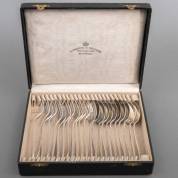 Twaalf 2e gehalte zilveren aposteltaartvorkjes, in cassette, gewicht 133 gram, 12 cm