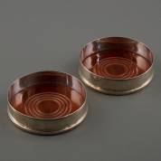 Paar 1e gehalte zilveren flessenbakken met geprofileerde randen en houten bodem, meester: Ernst Sieber, 's-Gravenhage, 1807-1809, brutogewicht 384 gram, Ø 15 × 3,5 cm -gebruikssporen-