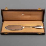 2e gehalte zilveren taartschep, art deco, meesterteken onleesbaar, gewicht 120 gram, 26 × 5 cm, in cassette
