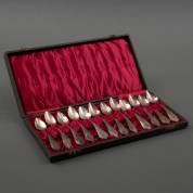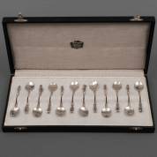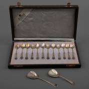 Twaalf 2e gehalte zilveren theelepels, theeschep en suikerschep, in cassette, meester: J.M. van Kempen & Zonen, Voorschoten, gewicht 107 gram