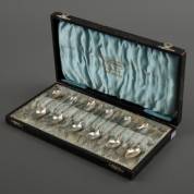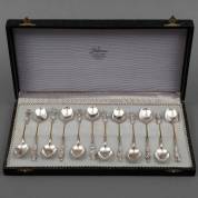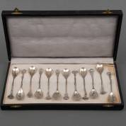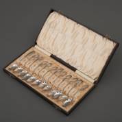 Twaalf 2e gehalte zilveren apostellepeltjes, in cassette, gewicht 88 gram, 11 cm