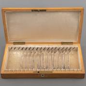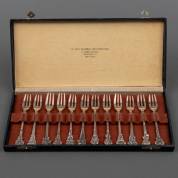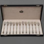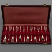Twaalf 2e gehalte zilveren aposteltaartvorkjes, in cassette, gewicht 134 gram, 12 cm