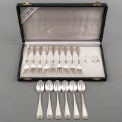 Negen 2e gehalte zilveren gebaksvorken, puntfilet, en zes 2e gehalte zilveren theelepels, rondfilet, gewicht 246 gram, vorken in cassette voor twaalf