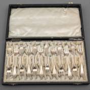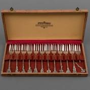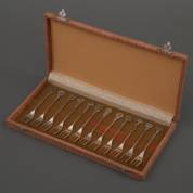 Twaalf 2e gehalte zilveren gebaksvorkjes met waaiersteel, meester: J.M. van Kempen en Zonen, Voorschoten, 122 gram, in cassette