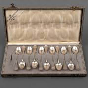 Twaalf 2e gehalte zilveren aposteltheelepels, in cassette, gewicht 127 gram, 11,5 cm