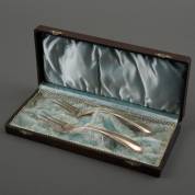 Paar 2e gehalte zilveren vleesvorken met parelrand, 1901, gewicht 59 gram, in originele cassette