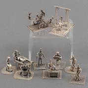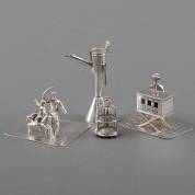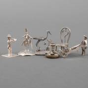 Zes zilveren miniaturen: visverkoper, 1827, ooievaar bij schoorsteen, stoel, blaker, fluitist en trompettist, diverse gehaltes, gewicht 63 gram