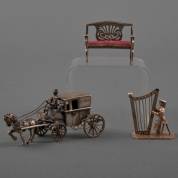 Drie zilveren miniaturen: 1e gehalte zilveren bankje met rood beklede zitting, 2e gehalte zilveren koets, en 2e gehalte zilveren harpiste, brutogewicht 101 gram, 8 × 4 × 4 cm