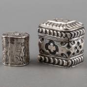 Twee 2e gehalte zilveren lodereindoosjes, beide met stippelgravering op de bodem, rechthoekig model, 1882, kleinste met gedreven scenes, 1848, gewicht 44 gram, rechthoekig model 4,5 × 3,5 × 3,2 cm