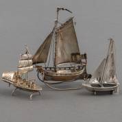 Drie zilveren miniaturen, diverse gehaltes, schommelscheepje en twee zeilboten, gewicht 43 gram schommelscheepke 9,5 × 5 × 2,5 cm