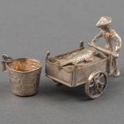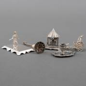 Vier zilveren miniaturen: 2e gehalte zilveren man met speeldoos, 20e eeuw, 2e gehalte zilveren snotneus, onduidelijk meesterteken: ?ZP, 19e/20e eeuw, ezeltje rijden, pseudokeuren, en 2e gehalte zilveren vogelkooitje, meester: A.F. Westerwaal, Amsterdam, 20e eeuw, totaalgewicht 100 gram