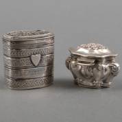 2e gehalte zilveren lodereindoosje met bandmotieven, filigrain en hartdecor, 1852, en 3e gehalte zilveren lodereindoosje, Duitsland, 19e eeuw, gewicht 39 gram, grootste 4 × 4 × 2,8 cm