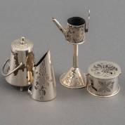 Vier zilveren miniaturen: vogelkooi, strooier in de vorm van een hoorn, kolenhelm, en schommel, diverse gehaltes, gewicht 106,7 gram